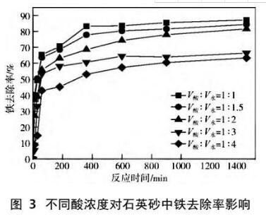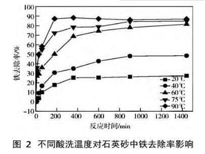 由上圖可知,酸洗溫度的提升會加快反應(yīng)速率和提高鐵去除率,但這種提升效果會隨著溫度的增高趨于減弱。鐵去除率隨著時間延長而變大,酸洗溫度較高時去除率較大,且去除率曲線短時間內(nèi)上升較快,隨后趨于平緩。
