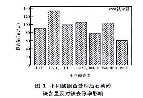 結(jié)果表明,三元混酸酸洗除鐵效果最好。其中,鹽酸具有良好的金屬溶解能力,且對鐵離子有絡(luò)合性;硝酸能有效的氧化金屬元素生成可溶性鹽,但單獨使用時效果欠佳;氫氟酸對二氧化硅、云母、長石等都具有明顯的溶蝕作用,加入氫氟酸可明顯提升除鐵效果;混酸酸洗可產(chǎn)生協(xié)同效應(yīng),有利于提高雜質(zhì)去除效率。